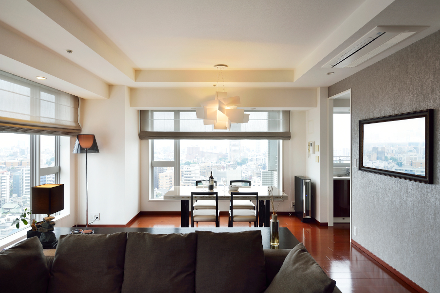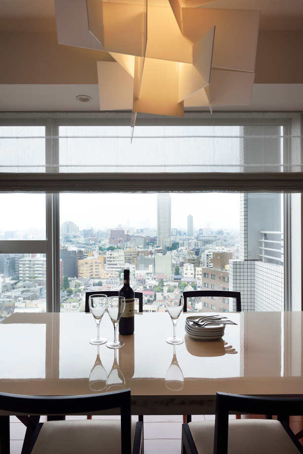 都心の高層マンション窓からの羨望を楽しみながらのホームパーティ。