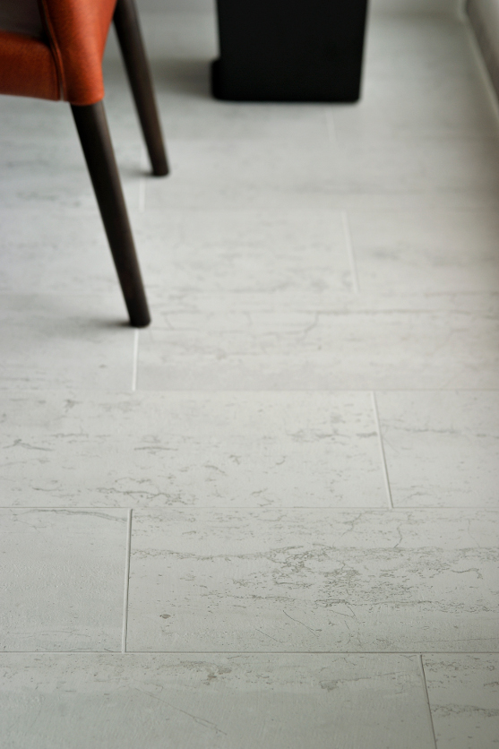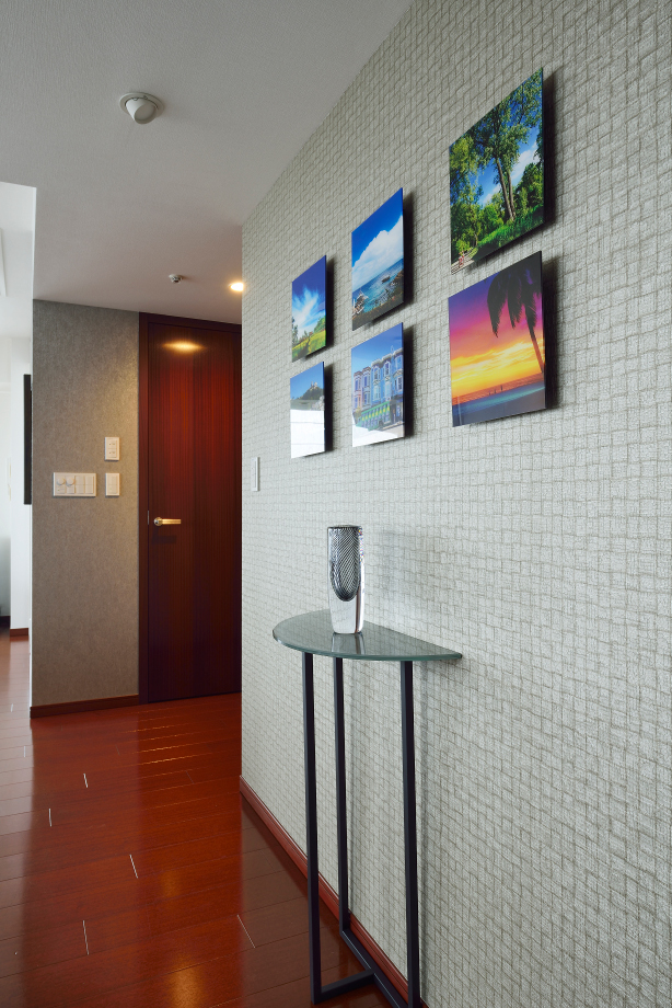 築10年の高層マンションリフォームです。 リビング・ダイニングの横にあった洋室の間仕切りを取り払い、広く開放的なリビング・ダイニング に変更。リビングとダイニングを視覚的に仕切るためリビング部分の床を少し上げて大判のタイルを貼りました。 タイルの立ち上がり部分には、ステンレスを巻きスタイリッシュなインテリアに仕上げています。廊下であった部分もリビング・ダイニングに取り込み、お施主様の趣味である写真を飾るギャラリーコーナーを設けました。