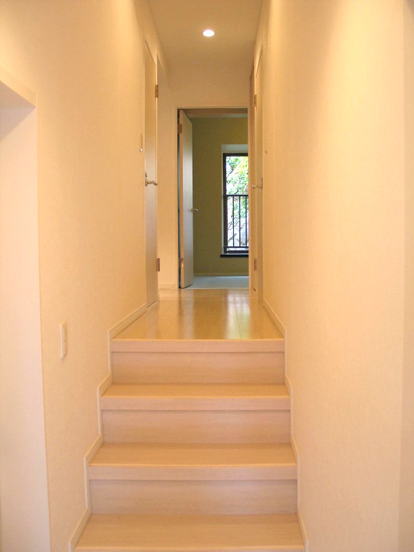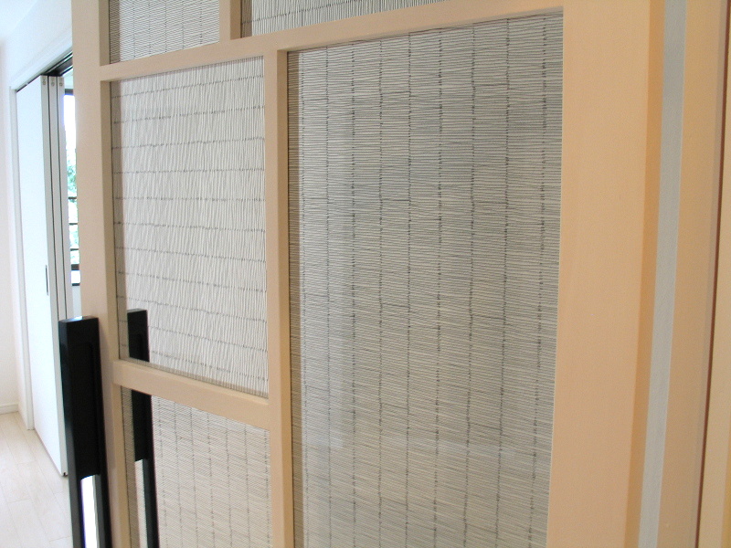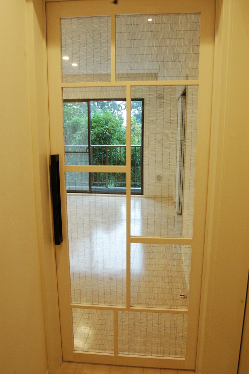 玄関を入って廊下から階段を見下ろすとその先にガラスの扉を通して入る自然光がリビングへと導いてくれます。この扉をあけたままにしておくとリビングの窓から心地よい風が家じゅうに行き 渡ります。この扉は特注でデザインして作っています。太い桟と細い桟を使い、手書きのような黒の横線がおもしろいプリントガラスを使っています。横目と縦目を交互にはめ込みあそびごごろを プラスしました。