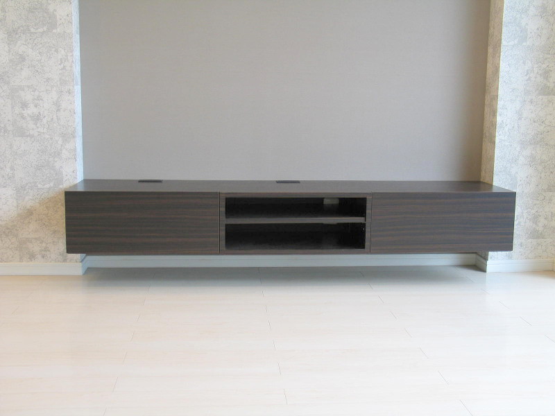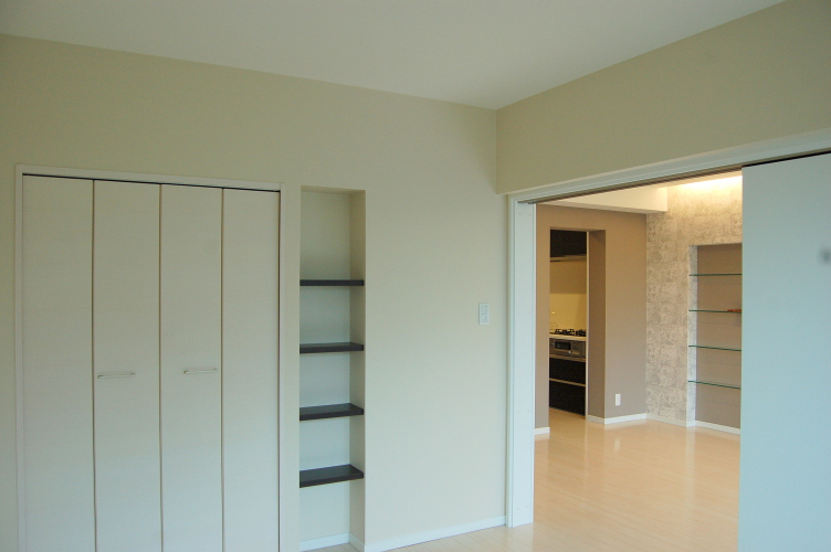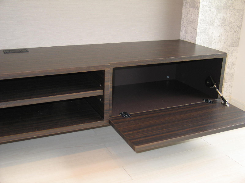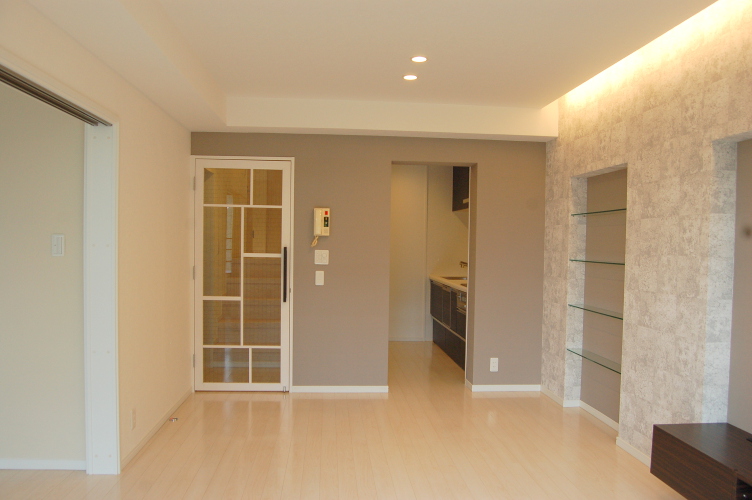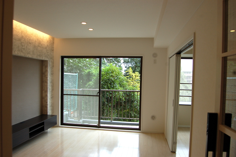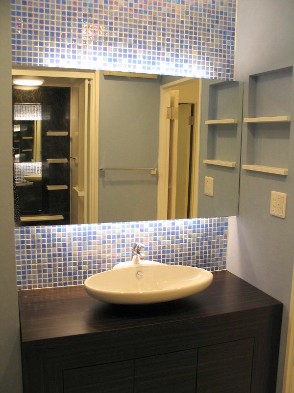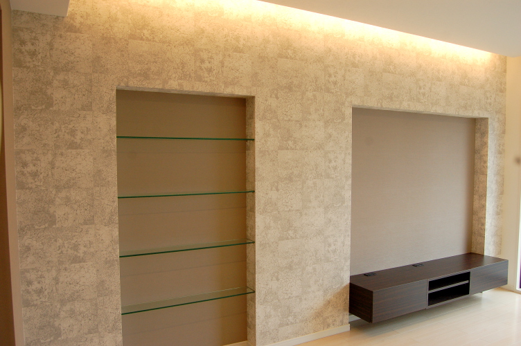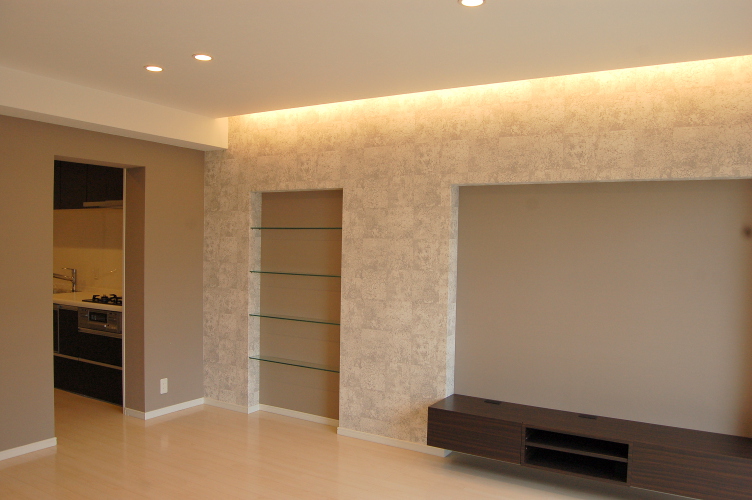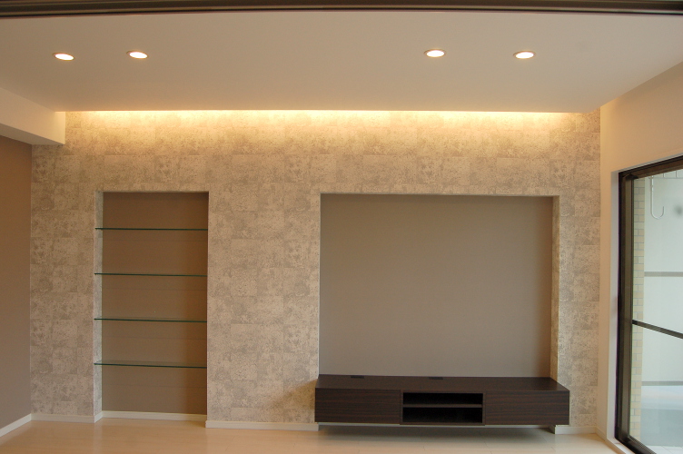 TVボード・洗面台・上部ミラー・ガラスの飾り棚・本棚・そしてリビングのガラスドアなどこの部屋のためにオーダーでデザインして造り付けました。 間取りを大きく変えることが難しい壁式構造のマンションですが、心地のよい住まいになりました。