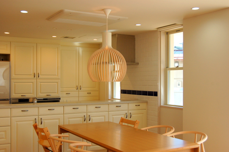フローリングや家具には、オーク材を使用し6人掛けのダイニングテーブルの上には、北欧の木製でできた 大きめなペンダントライトを選んでいます。大き目な木製のペンダントから漏れる光があたたかい雰囲気を醸し出しています。