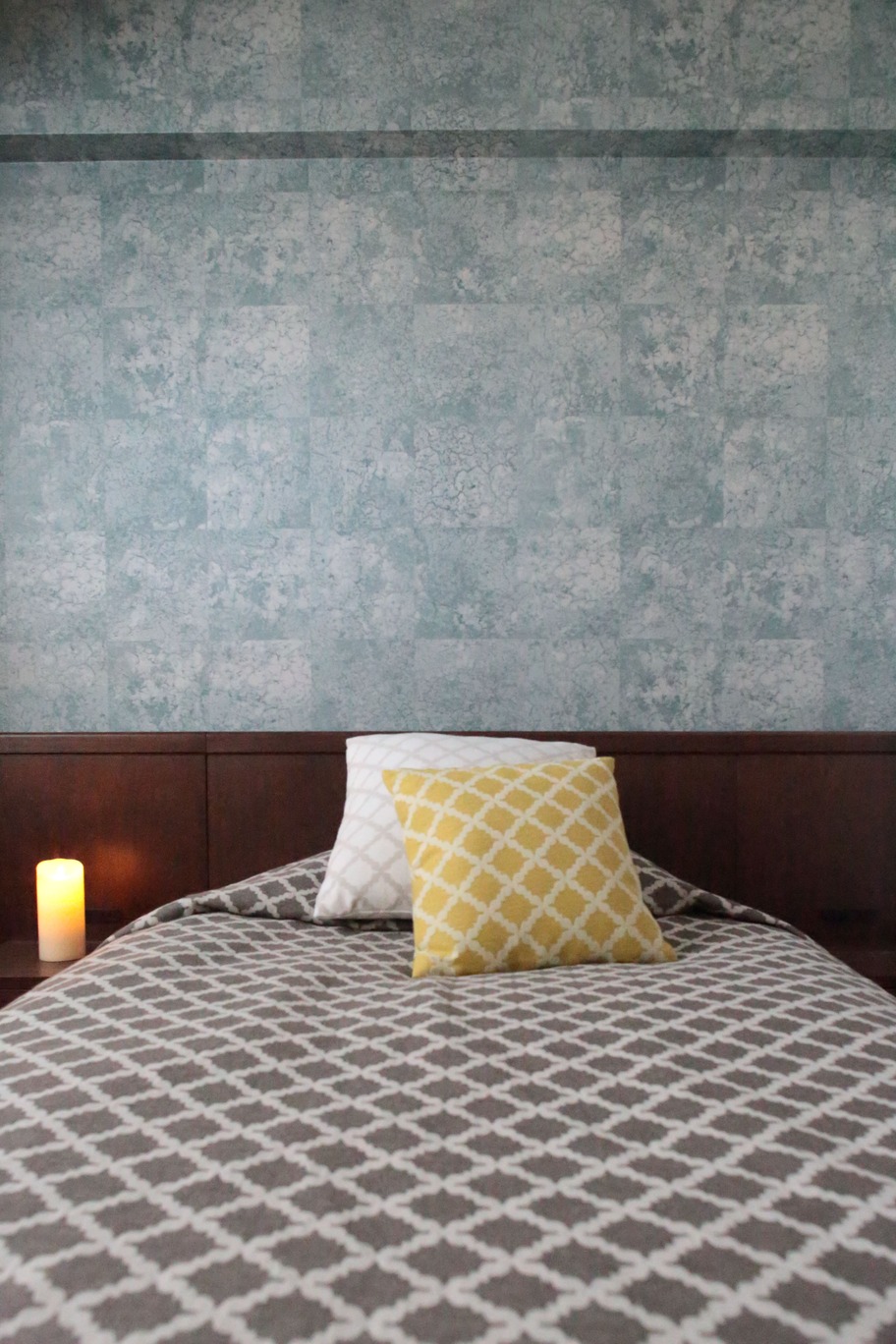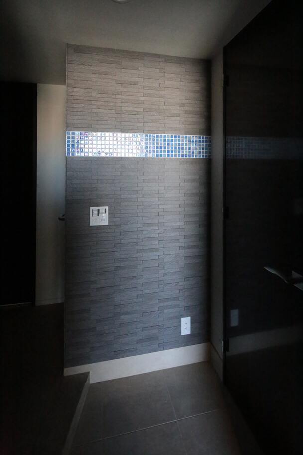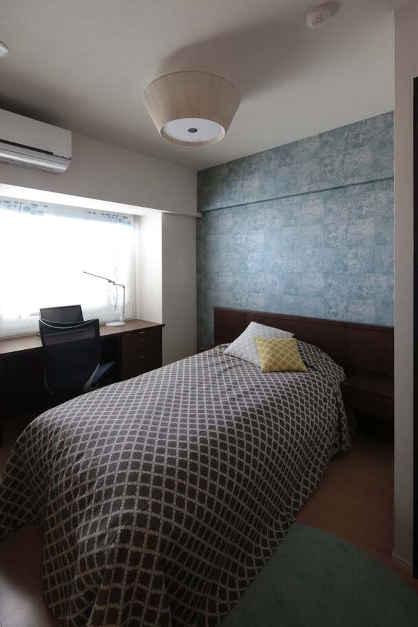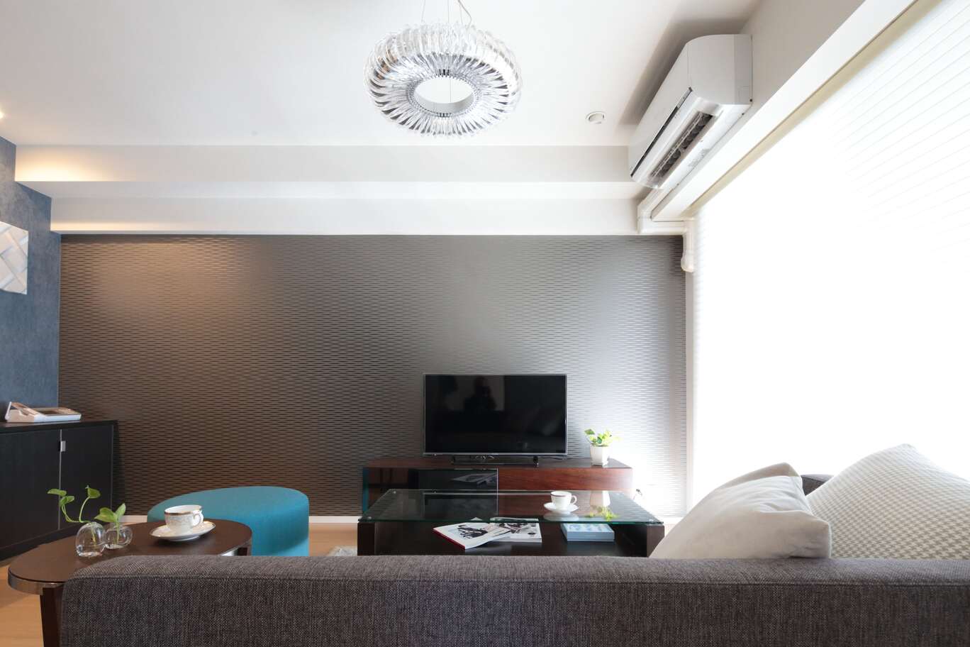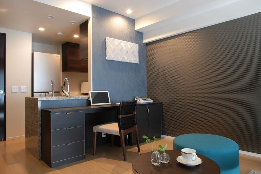 都心にセカンドハウスとして購入された新築マンションコーディネートです。 セカンドハウスということもあり、生活感のないホテルのような空間をご希望されました。 リビング・ダイニングは、広く使うためダイニングテーブルはおかずにキッチンカウンター沿いに収納を持つデスクを造り付けました。上部天井には、ダウンライト を設けパソコンをいじったり、軽食ができるカウンターテーブルとしても利用できます。 リビングは、濃い茶色の建具に合わせたグレーの入ったWAVE模様の壁紙、グレーとブラウンの家具でまとめ、ブルーのスツールをアクセントで使っています。
